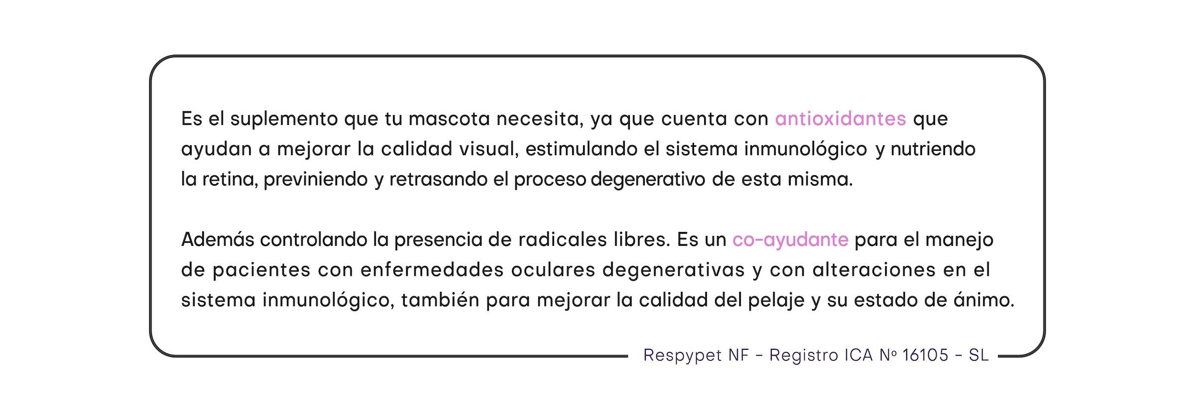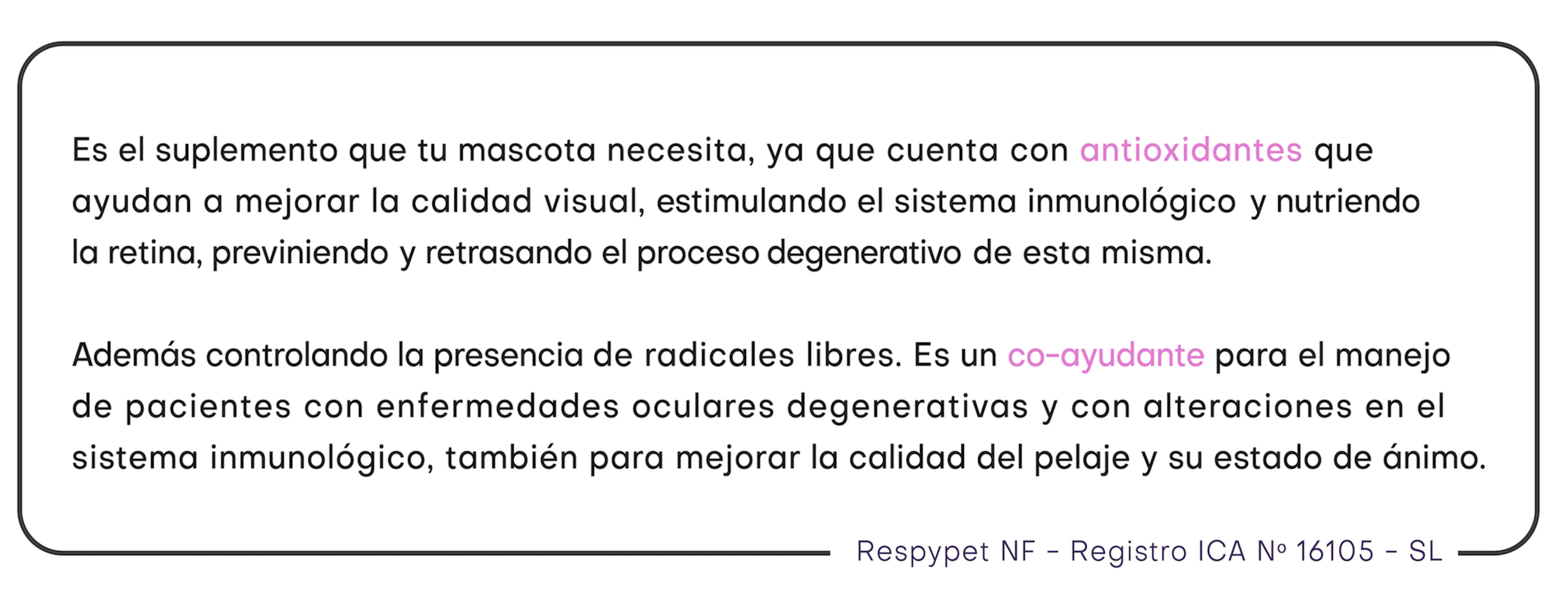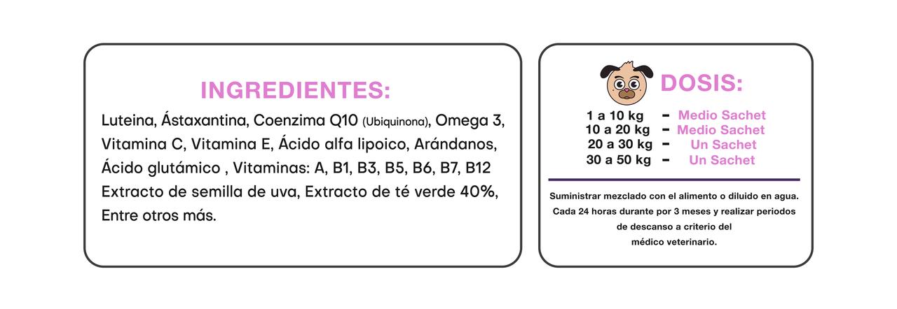 Es el suplemento que tu mascota necesita, ya que cuenta con antioxidantes que ayudan a mejorar la calidad visual, estimulando el sistema inmunológico y nutriendo la retina, previniendo y retrasando el proceso degenerativo de esta misma. Respypet viene en una caja con 30 sobres.
